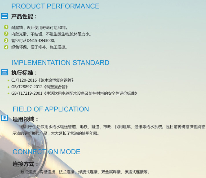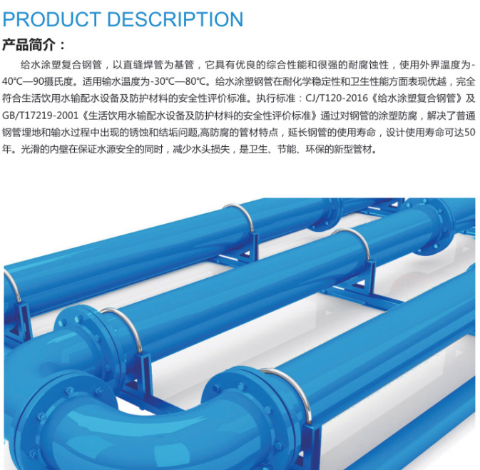 簡介:給水涂塑復(fù)合鋼管,以直縫焊管為基管,它具有優(yōu)良的綜合性能和很強的耐腐蝕性,使用外界溫度為-40℃-90攝氏度,適用輸水溫度為30℃-80℃.給水涂塑鋼管在耐化學(xué)穩(wěn)定性和衛(wèi)生性能方面表現(xiàn)優(yōu)越,完全符合生活飲用水輸配水設(shè)備及防護(hù)材料的安全性評價標(biāo)準(zhǔn)。